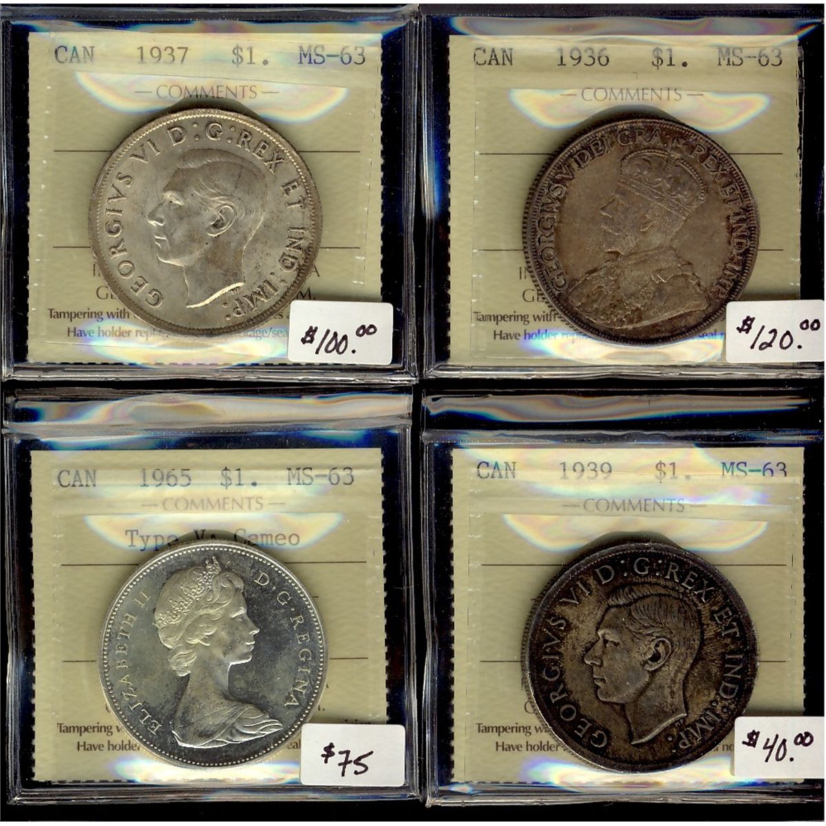1936 $1, 1937, 1939 & 1965 T.5 Cameo. Lot of 4 coins all ICCS MS63.