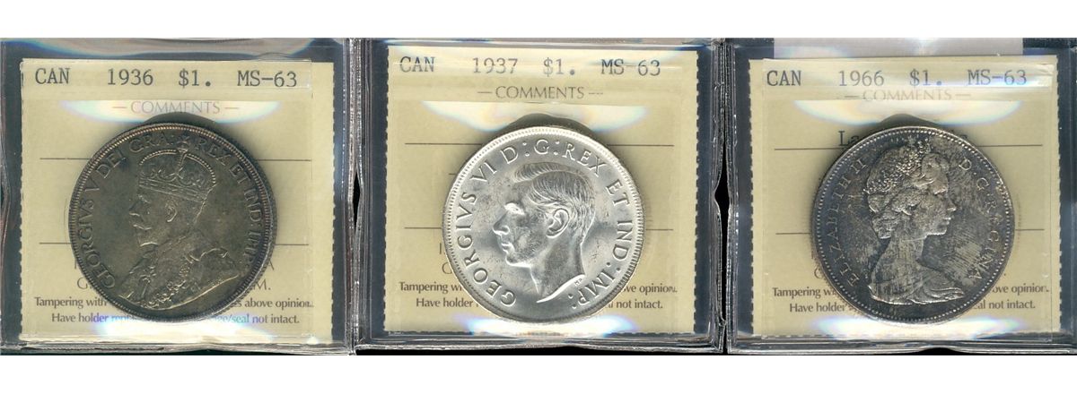 1936 $1, 1937 & 1966 ICCS MS63. Lot of 3 coins.