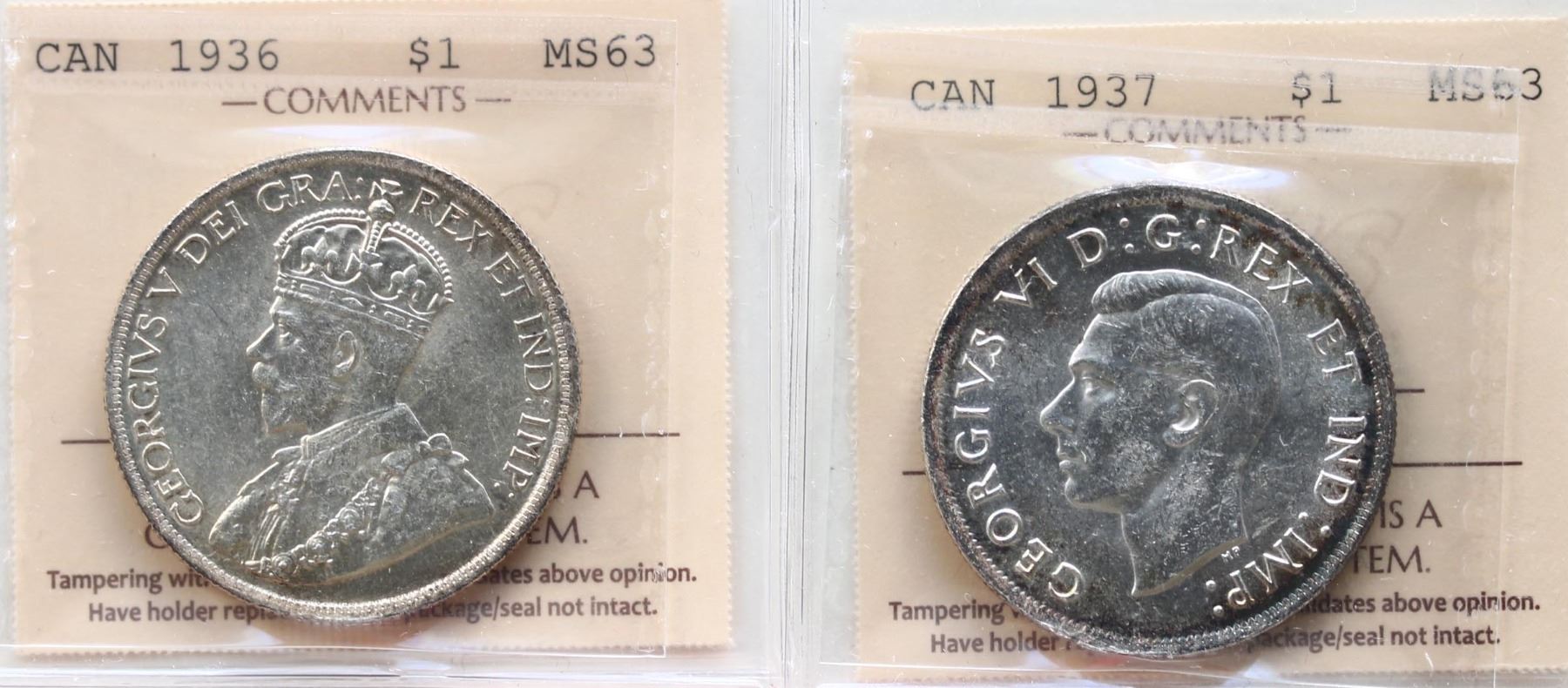 1936 $1, 1937. Both coins ICCS Choice Mint State-63