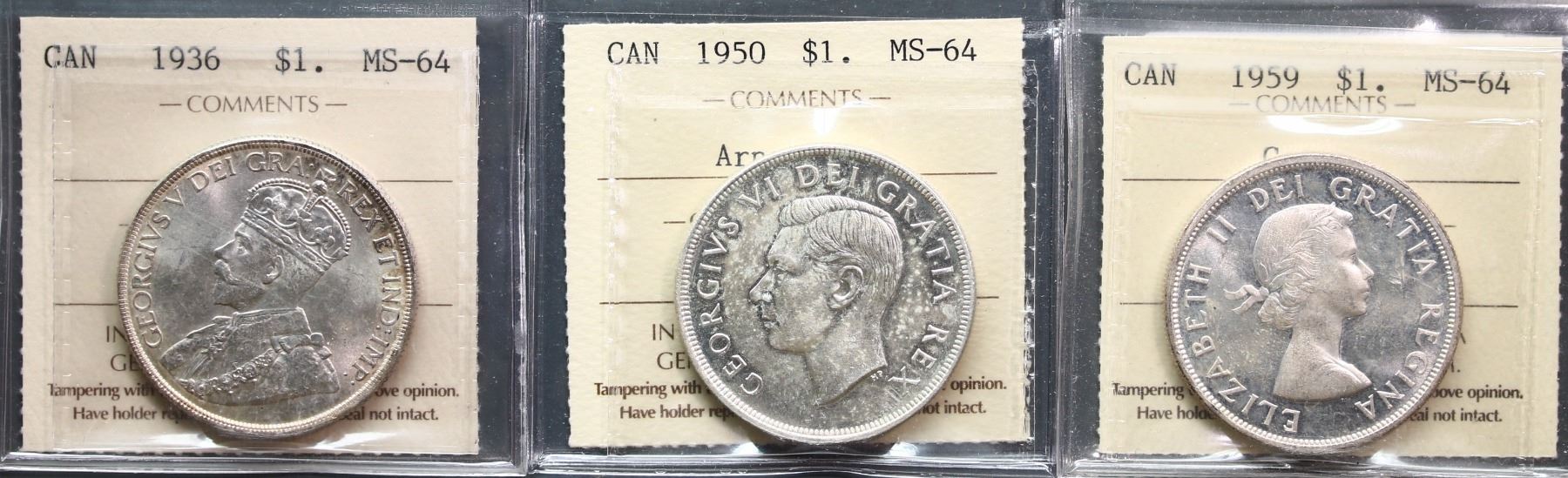 1936 $1, 1950 Arn, and 1959 Cameo, all ICCS Choice Mint State-64, lot of 3 coins.