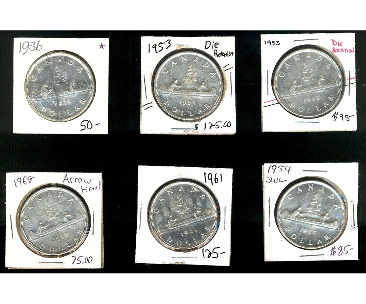 1936 $1, 1953 SF, 1953 NSF, 1954 SWL, 1961 & 1962. Lot of 6 coins all cleaned some with varieties,