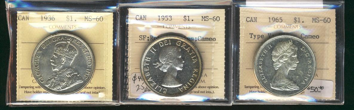 1936 $1, 1953 SF Rotated Dies Cameo & 1965 Type 5 Cameo ICCS MS60. Lot of 3 coins.