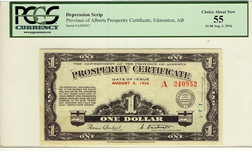 1936 $1 A-1 Prosperity certificate #A240952, 13 stamps on back, PCGS AU55