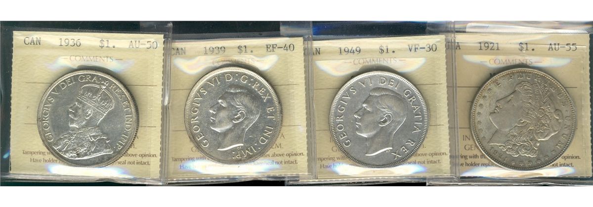 1936 $1 AU50, 1939 EF40, 1949 VF30 & US 1921 Morgan AU55. Lot of 4 coins all ICCS graded.