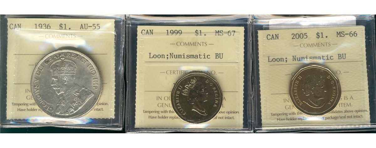 1936 $1 AU55, 1999 $1 Loon MS67 & 2005 Loon both NBU. Lot of 3 ICCS coins.
