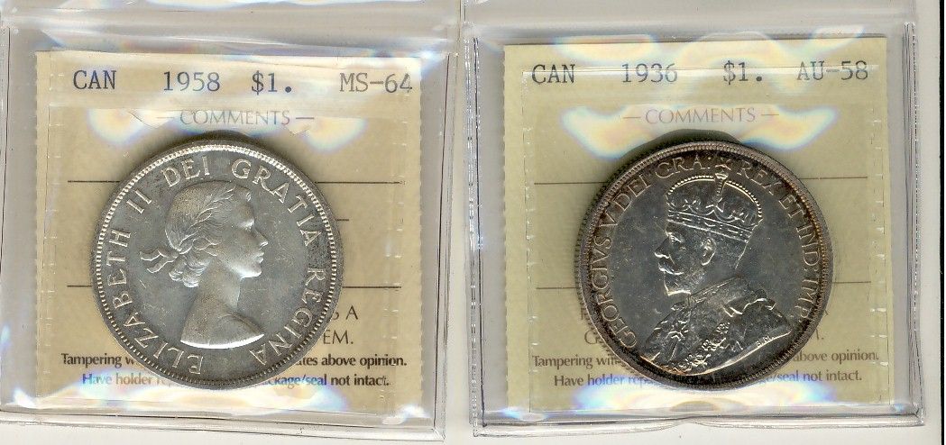 1936 $1 AU58 & 1958 MS64. Lot of 2 ICCS coins.