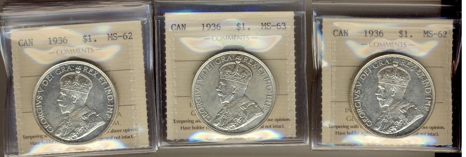 1936 $1 ICCS MS62 (5) MS63 (5), Lot of 10 coins