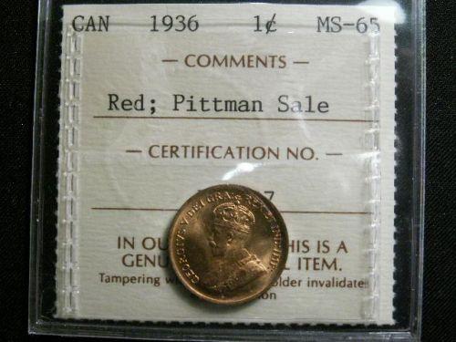 1936 1¢ ICCS MS65 Red PQ. A very flashy coin! Excellent strike and clean fields. From the "Pittman" sale.