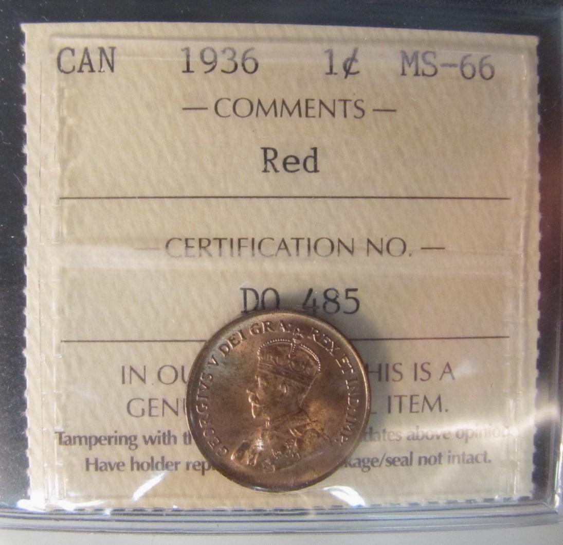 1936 1¢ ICCS MS66RD. 90% red with superb lustre.