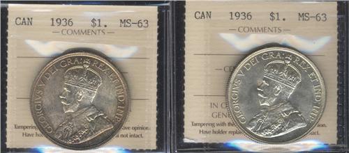 1936 $1. Lot of two mintstate examples certified as ICCS MS63