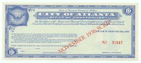 1936 $10 Depression Scrip Atlanta, GeorgiaEstimate: $60