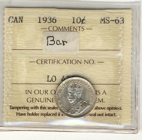 1936 10¢ ICCS MS63. Not designated on holder, but a nice Bar example.