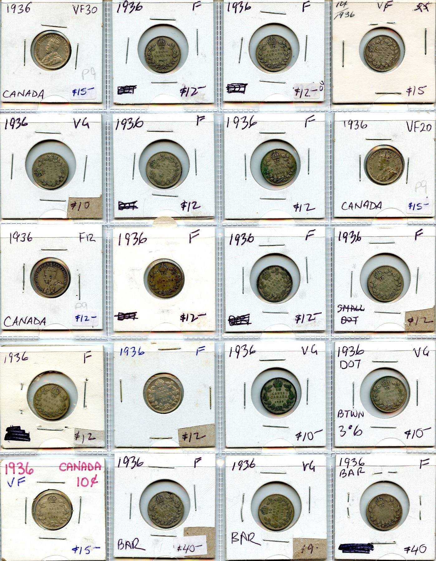 1936 10¢ lot of 20 coins, some wrongly designated as Bar or Dot, all in average condition.