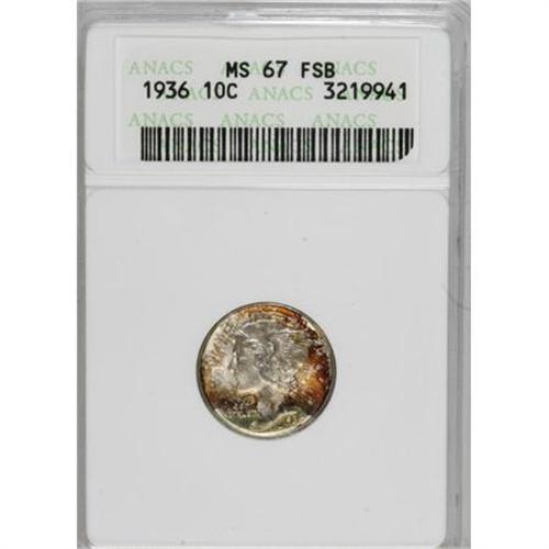 <B>1936 10C MS67 Full Bands ANACS.</B></I> NGC Census: (59/2). PCGS Population (125/10). Mintage: 87,504,128. Numismedia Wsl. Price for NGC/PCGS coin in MS67: $400. (#4999)<BR><BR><b>Shipping:</b> Coins & Currency (<a target="_blank" href="http://www.heritageauctions.com/common/shipping.php">view shipping information</a>)
