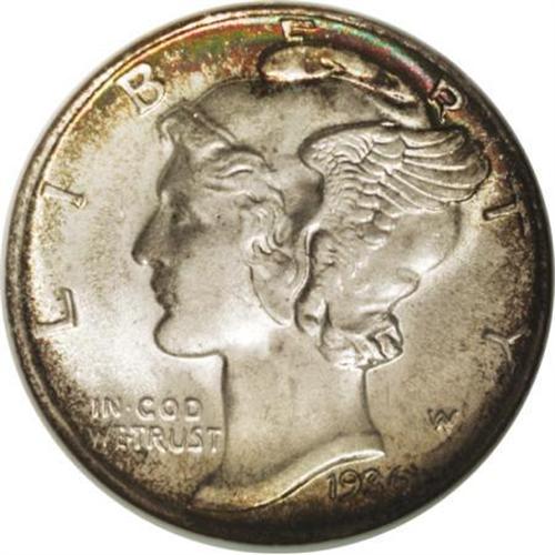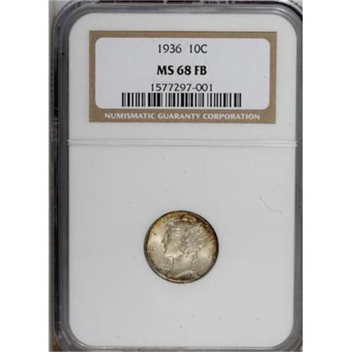 <B>1936 10C MS68 Full Bands NGC.</B></I> This is one of just two examples graded as MS68 Full Bands by NGC, with none finer (9/07). It is fully struck and shows a thin band of deep emerald-green, violet, and golden-brown patina along the obverse border; the reverse is essentially free of toning. An extraordinary piece with near-pristine surfaces and great eye appeal. <BR><BR><B>Coin Engraver:</B> Adolph A. Weinman<BR><BR><b>Shipping:</b> Coins & Currency (<a target="_blank" href="http://www.heritageauctions.com/common/shipping.php">view shipping information</a>)