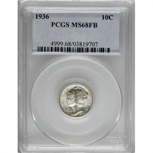 <B>1936 10C MS68 Full Bands PCGS.</B></I> Few coins of any type are preserved with the consummate care that seems evident with this specimen. The surfaces are delightfully smooth and clean, and display lovely pastel green and peach coloration. Just 12 examples have been graded at MS68 Full Bands by PCGS, with none finer, from an original mintage of 87.5 million pieces (6/07). <BR><BR><B>Coin Engraver:</B> Adolph A. Weinman<BR><BR><b>Shipping:</b> Coins & Currency (<a target="_blank" href="http://www.heritageauctions.com/common/shipping.php">view shipping information</a>\)