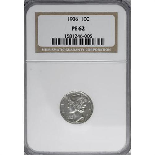 <B>1936 10C PR62 NGC.</B></I> Crisply struck and a fascinating example of this first-year proof Mercury dime issue. Though a number of scattered hairlines affect the fields and the obverse shows a measure of haze with a dot of deep patina behind Liberty's head, the reverse gleams beneath minimal champagne toning.<BR><BR><B>Coin Engraver:</B> Adolph A. Weinman<BR><BR><b>Shipping:</b> Coins & Currency (<a target="_blank" href="http://www.heritageauctions.com/common/shipping.php">view shipping information</a>)
