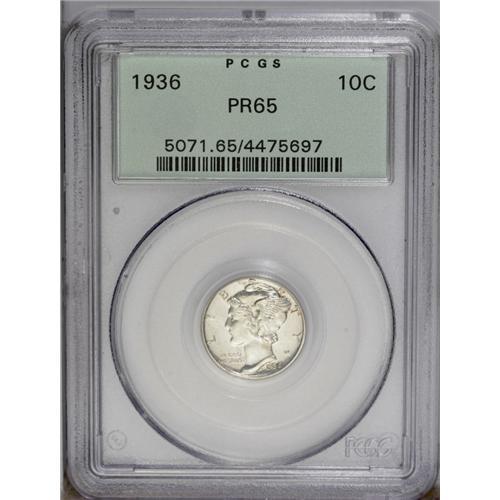 <B>1936<10C> PR65 PCGS.</B></I> A glittering Gem proof example of this first proof Mercury dime issue. Both sides have brilliant surfaces with no evidence of toning other than a faint haze.