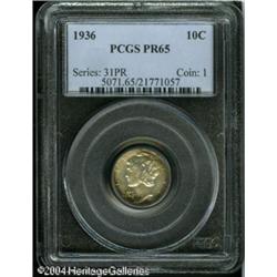 1936 10C PR65 PCGS. Beautiful lime-green, orange, <B>1936 10C PR65 PCGS.</B></I> Beautiful lime-green, orange, and fire-red colors dominate the borders of this well preserved and pleasing Gem. The key date to a collection of proof Mercury Dimes. <BR><BR><B>Important notice:</B> Heritage usually auctions material at the rate of 200-250 lots per hour. On some occasions eBay Live bid software or the Internet may not be able to keep up with the pace of the auction. We recommend placing a realistic absentee bid now as insurance to avoid disappointment. Occasionally the auctioneer may eliminate or reject an eBay Live bid, and the auctioneer may also reopen a lot after the close of the eBay live bidding (usually because we missed an audience bid), and may reject your bid even if it shows you as the winning bidder. By bidding via eBay Live, you agree that Heritage may award the lot to another bidder at its sole discretion under the circumstances described above or any other reasonable circumstances. Since eBay bids are not shown to us until we open the lot on the floor, we treat those bids just like floor bids. In most cases the floor responds before the eBay bid is presented to us, due to Internet lag time, so for consistency we have made it a policy that floor bids are always considered first over tie eBay live bids. Also please note that all Heritage lots purchased through eBay Live carry a 20% Buyer's Premium. Please make sure you read the Terms and Conditions before you bid. This lot is being auctioned in conjunction with a live floor auction by Heritage Galleries & Auctioneers. All final auction and invoice information will be supplied by Heritage Galleries & Auctioneers, and all other information should be considered preliminary. Lot:5838