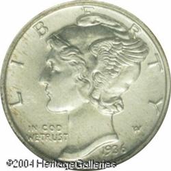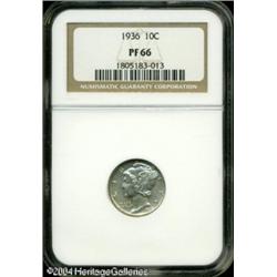 1936 10C PR66 NGC. First year of issue for modern <B>1936 10C PR66 NGC.</B></I> First year of issue for modern proofs and the key issue in the series with a mintage of only 4,130 pieces. This is a well preserved, uncleaned specimen that is lightly toned over both sides in opaque silver-gray shades. Population: 220 in 66, 47 finer (11/04). <BR><BR><B>Important notice:</B> Heritage usually auctions material at the rate of 200-250 lots per hour. On some occasions eBay Live bid software or the Internet may not be able to keep up with the pace of the auction. We recommend placing a realistic absentee bid now as insurance to avoid disappointment. Occasionally the auctioneer may eliminate or reject an eBay Live bid, and the auctioneer may also reopen a lot after the close of the eBay live bidding (usually because we missed an audience bid), and may reject your bid even if it shows you as the winning bidder. By bidding via eBay Live, you agree that Heritage may award the lot to another bidder at its sole discretion under the circumstances described above or any other reasonable circumstances. Since eBay bids are not shown to us until we open the lot on the floor, we treat those bids just like floor bids. In most cases the floor responds before the eBay bid is presented to us, due to Internet lag time, so for consistency we have made it a policy that floor bids are always considered first over tie eBay live bids. Also please note that all Heritage lots purchased through eBay Live carry a 20% Buyer's Premium. Please make sure you read the Terms and Conditions before you bid. This lot is being auctioned in conjunction with a live floor auction by Heritage Galleries & Auctioneers. All final auction and invoice information will be supplied by Heritage Galleries & Auctioneers, and all other information should be considered preliminary. Lot:5839