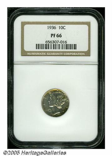 <B>1936<10C> PR66 NGC.</B></I> Premium Gem glassy surfaces with yellow peripheral toning. Needle sharp, with no flaws worthy of note. As of (6/05) NGC has only graded 52 pieces finer.
