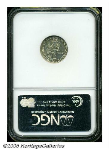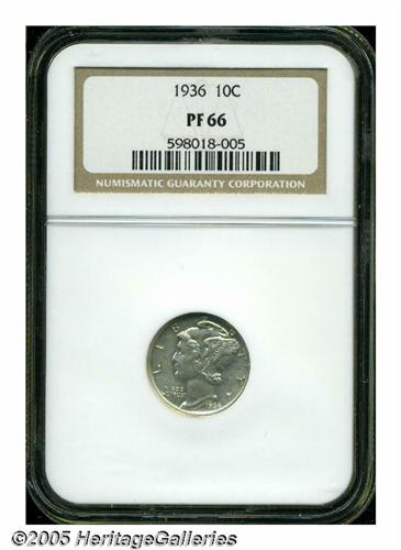 <B>1936<10C> PR66 NGC.</B></I> This is a lovely Gem Proof with brilliant silver surfaces and dusky champagne toning. Collectors of proof type coins often choose this issue as an example of the first proof Mercury Dime.