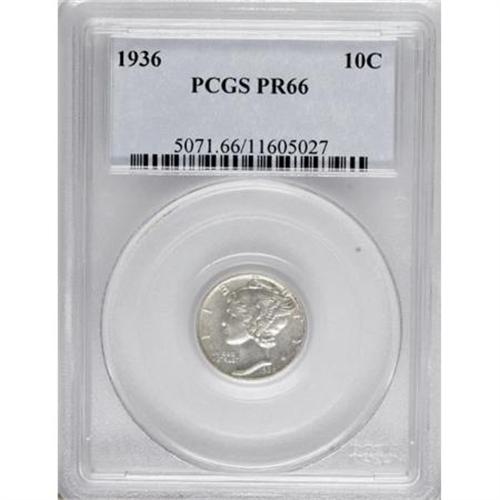 <B>1936 10C PR66 PCGS.</B></I> A Premium Gem proof, this splendid dime is sharply detailed with deep mirrors on both sides. The surfaces have subdued silver color with hints of pale gold toning. The Mint stopped producing proof coins in 1916, just before the start of Mercury dime coinage, thus the 1936 is the first proof in the series.<BR><I>From The Vanek Collection.</B></I><BR><BR><b>Shipping:</b> Coins & Currency (<a target="_blank" href="http://www.heritageauctions.com/common/shipping.php">view shipping information</a>)