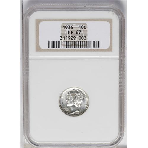 <B>1936<10C> PR67 NGC.</B></I> Crisply struck and essentially pristine, with highly reflective fields, the bright silver surfaces reveal a rainbow of pastel colors on each side, within those same field areas. First year of issue and the key date to the proof Mercury dime series.