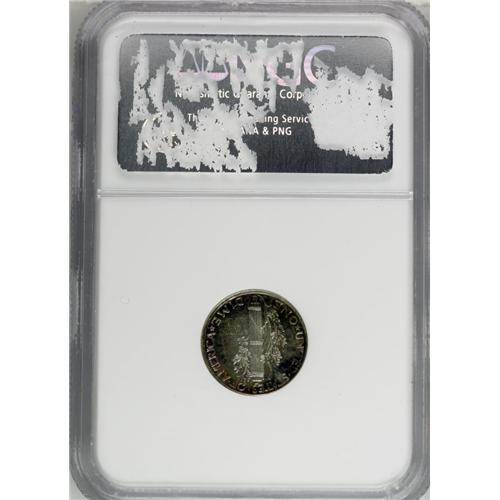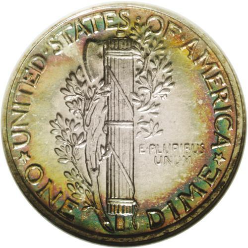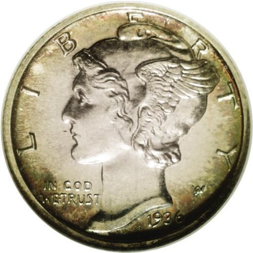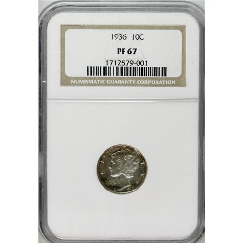<B>1936<10C> PR67 NGC.</B></I> The premier proof issue in the Mercury dime series, the 1936 is also a key date with just 4,130 pieces produced. In addition to smooth, expertly preserved surfaces, this important Superb Gem possesses noteworthy originality. Both sides are overlaid in warm, tan-gray patina with rainbow-like peripheral accents including jade-green, crimson-magenta, and bright-golden. Glassy reflectivity is seen at all angles, as is needle sharp striking definition. Census: 64 in 67, 1 finer (7/06).