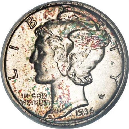 <B>1936 10C PR67 NGC.</B></I> Wonderful gold, aqua, and maroon coloration dapples the obverse, while the reverse is more subdued and evenly gold-tinged. The 1936 proof Mercury dime issue is by far the rarest in Gem proof or finer condition of the 1936-42 proofs. Sharp and delightful! Population: 43 in 67, 1 finer (3/08).<BR><BR><B>Coin Engraver:</B> Adolph A. Weinman<BR><BR><b>Shipping:</b> Coins & Currency (<a target="_blank" href="http://www.heritageauctions.com/common/shipping.php">view shipping information</a>)