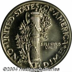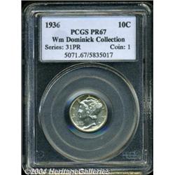 <B>1936<10C> PR67 PCGS. Ex: William Dominick Collection.</B></I> Undoubtedly one of the finest 1936 proof Dimes we have ever seen, and yet this coin is representative of the quality seen throughout the entire collection of Mercury Dimes assembled by William Dominick. The fields show illimitable depth of reflectivity--not always a given on this date--and one would be hard-pressed to locate even the tiniest imperfection on the surfaces. The coin presents as brilliant but close examination reveals just the slightest hint of light golden-brown patina on the obverse. Population: 36 in 67, 1 finer (7/04). <BR><BR><B>Important notice:</B> Heritage usually auctions material at the rate of 200-250 lots per hour. On some occasions eBay Live bid software or the Internet may not be able to keep up with the pace of the auction. We recommend placing a realistic absentee bid now as insurance to avoid disappointment. Occasionally the auctioneer may eliminate or reject an eBay Live bid, and the auctioneer may also reopen a lot after the close of the eBay live bidding (usually because we missed an audience bid), and may reject your bid even if it shows you as the winning bidder. By bidding via eBay Live, you agree that Heritage may award the lot to another bidder at its sole discretion under the circumstances described above or any other reasonable circumstances. Since eBay bids are not shown to us until we open the lot on the floor, we treat those bids just like floor bids. In most cases the floor responds before the eBay bid is presented to us, due to Internet lag time, so for consistency we have made it a policy that floor bids are always considered first over tie eBay live bids. Also please note that all Heritage lots purchased through eBay Live carry a 20% Buyer's Premium. Please make sure you read the Terms and Conditions before you bid. </span></font></tr></table></td></tr></table>