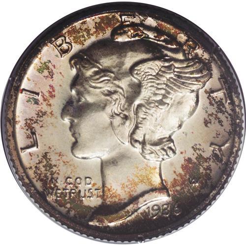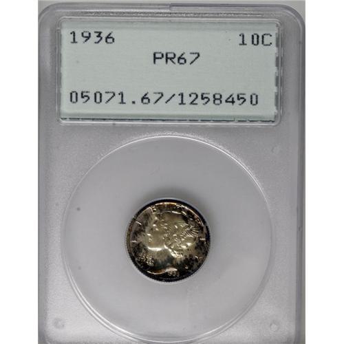 <B>1936 10C PR67 PCGS.</B></I> Splashes of russet-gold and sea-green visit the obverse periphery, while the remainder of this exactingly struck Superb Gem is brilliant. No hairlines or other abrasions are visible. The lowest proof mintage of the type. Encased in a first generation holder. Population: 42 in 67, 1 finer (1/07).<BR><BR><b>Shipping:</b> Coins & Currency (<a target="_blank" href="http://www.heritageauctions.com/common/shipping.php">view shipping information</a>)