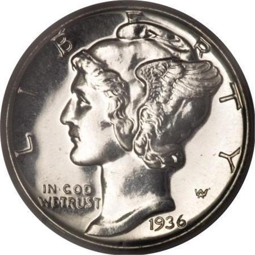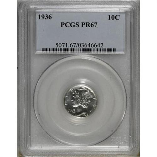 <B>1936 10C PR67 PCGS.</B></I> Full brilliance is present on both sides of this Superb Gem proof, each displaying an even distribution of milky speckles under magnification. Exquisite detail exists throughout, befitting a proof strike. Immaculately preserved surfaces are without mentionable contact marks or unsightly spots. Population: 43 in 67, 1 finer (3/08).<BR><BR><B>Coin Engraver:</B> Adolph A. Weinman<BR><BR><b>Shipping:</b> Coins & Currency (<a target="_blank" href="http://www.heritageauctions.com/common/shipping.php">view shipping information</a>)