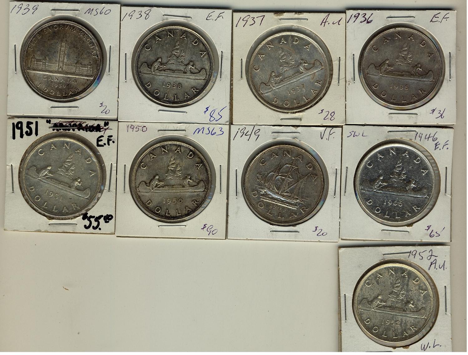 1936, 1937, 1938, 1939, 1946, 1949, 1950, 1951 & 1952 $1. Lot of 9 coins all VF to AU.