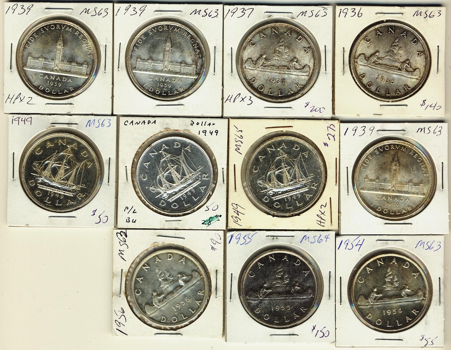1936, 1937, 1939(3), 1949(3), 1954, 1955 & 1956 $1. Lot of 11 coins all UNC+++.