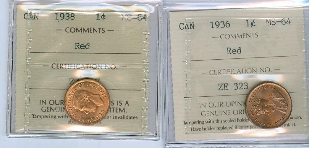 1936 & 1938 1¢ ICCS MS64RD. Lot of 2 coins.