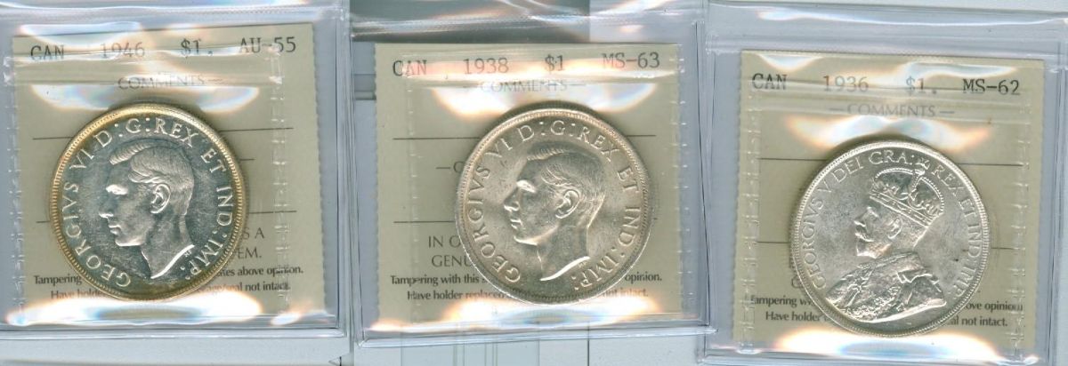 1936, 1938 & 1946 ICCS $1. Lot of three coins including 1936 MS62, 1938 MS63 and 1946 AU55.