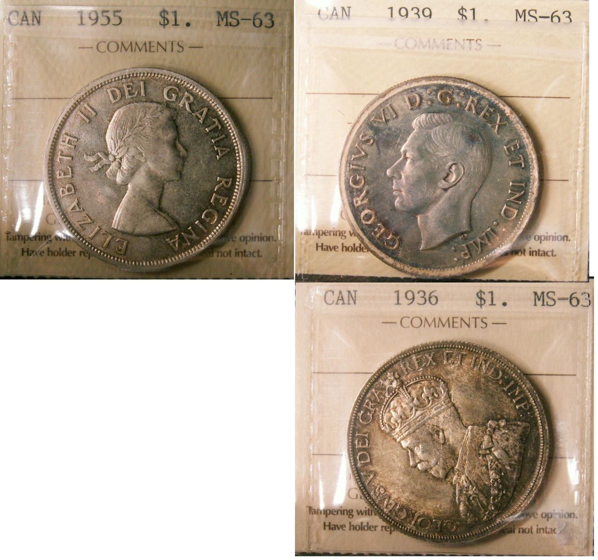 1936, 1939 & 1955 $1 ICCS MS63. Lot of 3 coins all same grade.