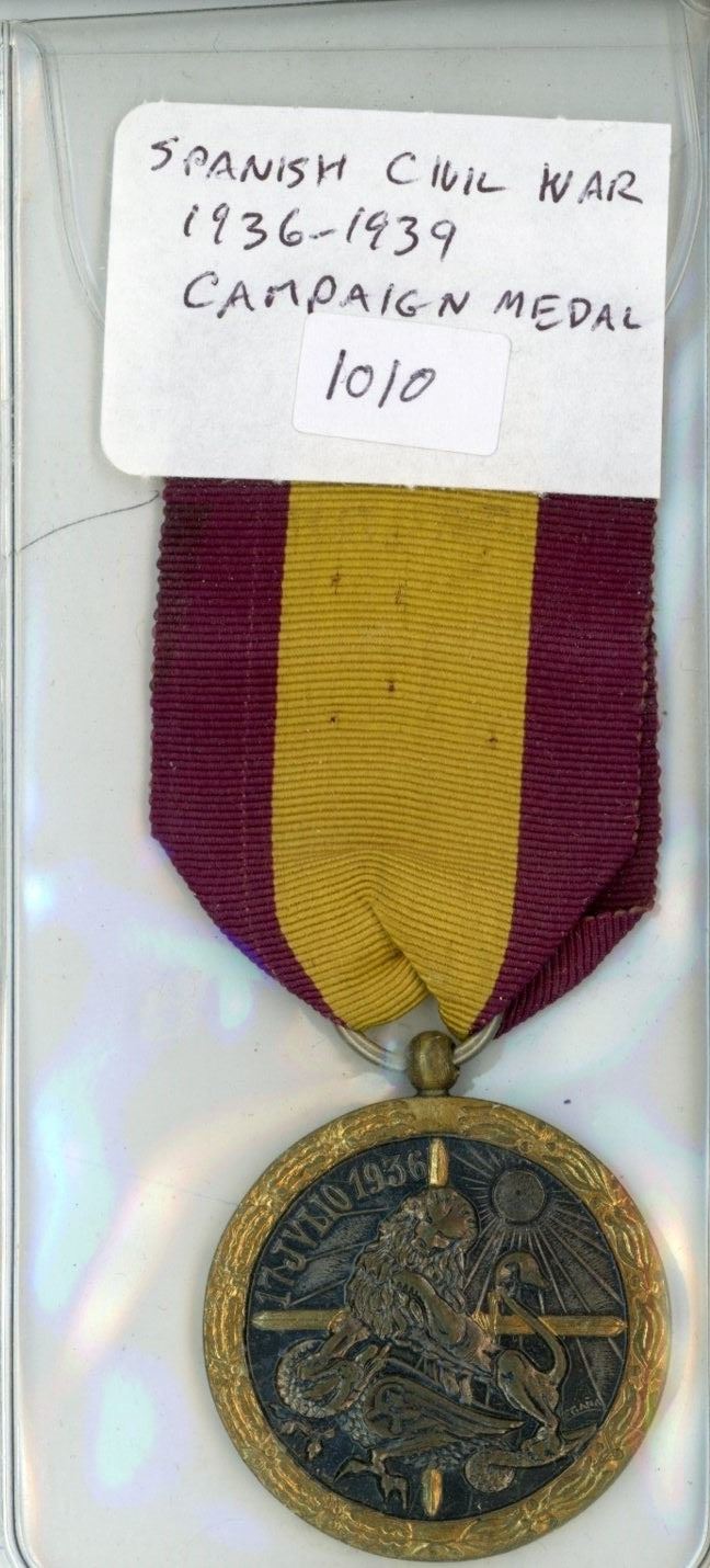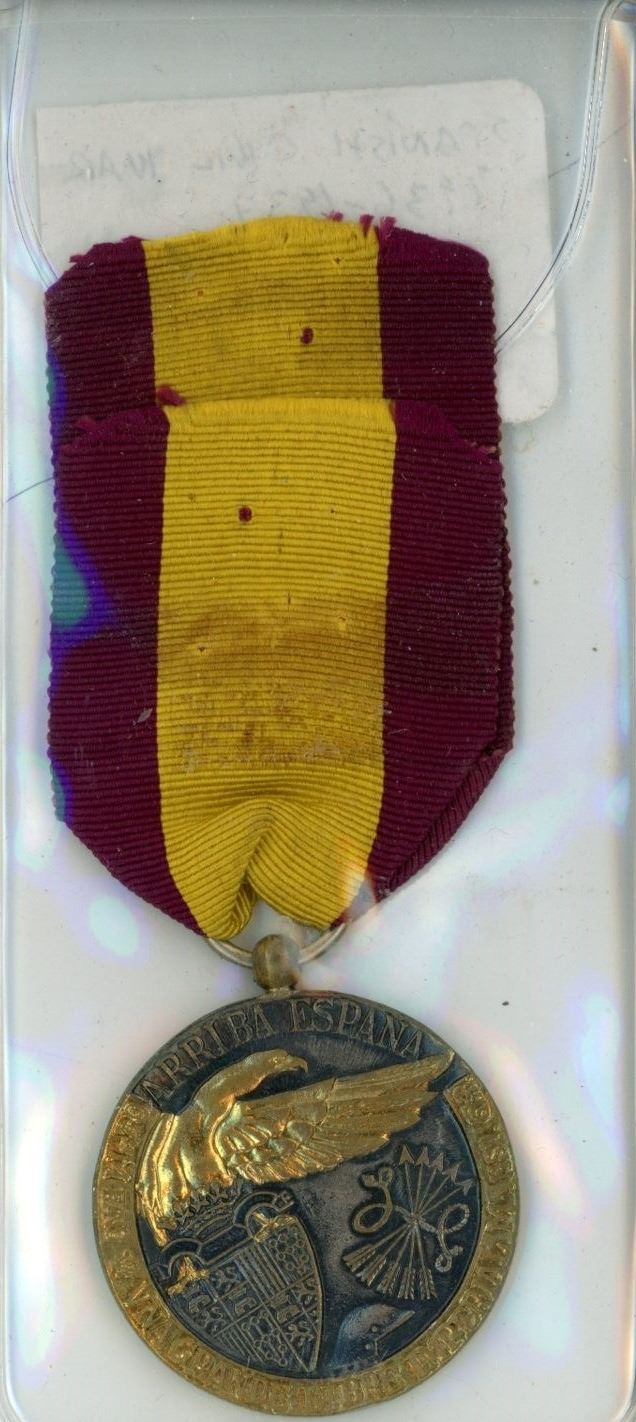 1936 – 1939 Spanish Civil War Campaign Medal. Issued to front-line Falangist forces fighting the elected Republican government during the Spanish Civil War. Black lion seated on defeated dragon with hammer and sickle (representing Communism). Issued by Dictator General Francisco Franco.