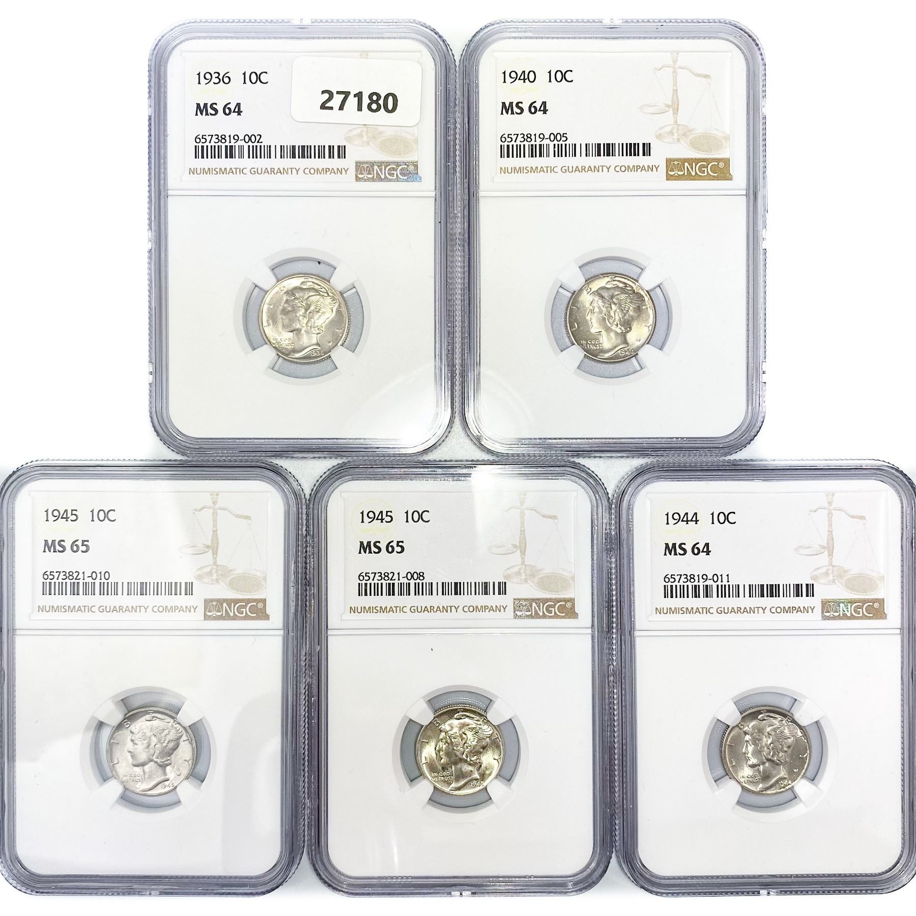 1936-1945 Set (5) Mercury Silver Dime NGC MS