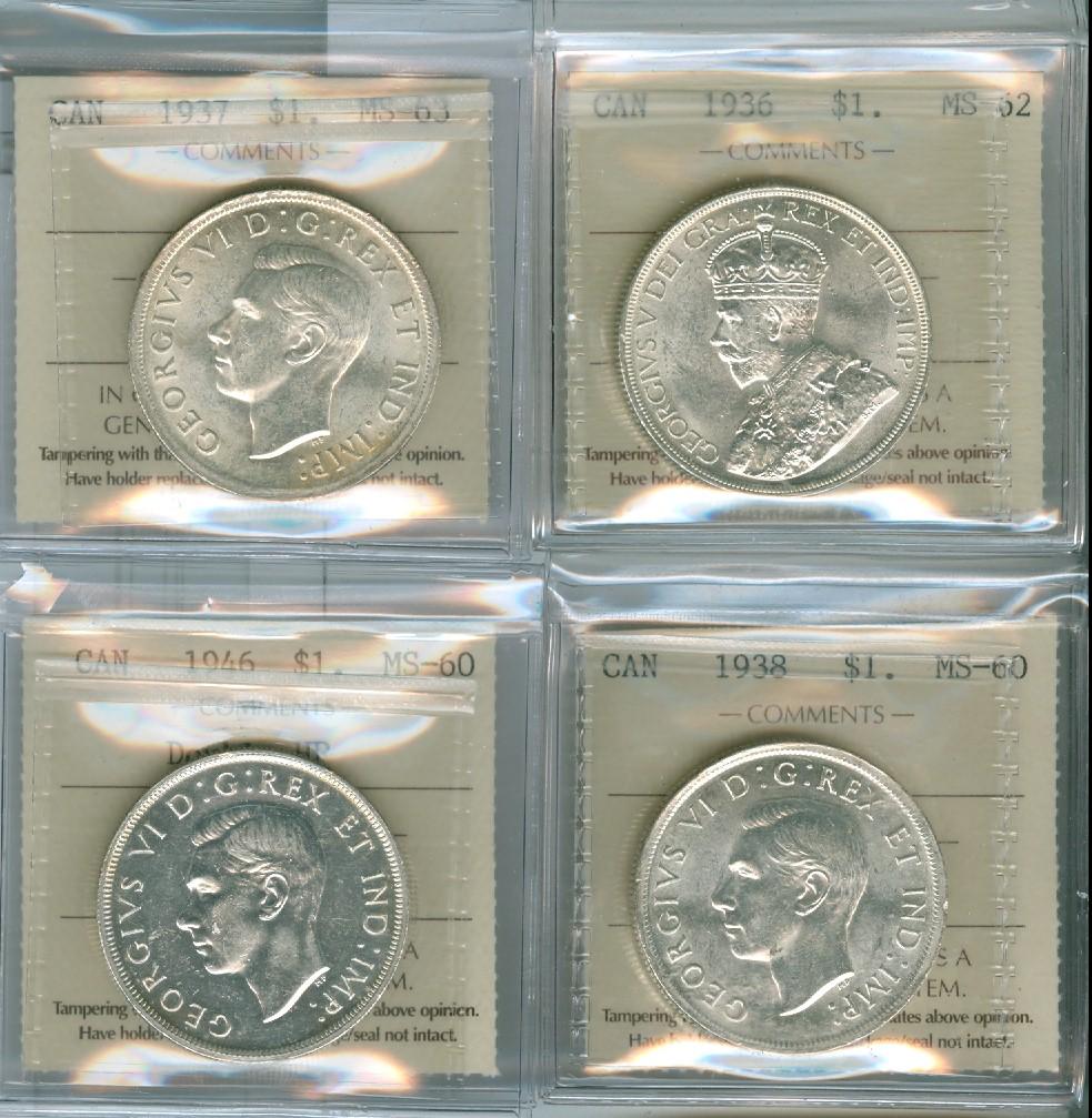 1936 - 1946 $1. Lot of four ICCS graded Silver Dollars. Includes 1936 MS62, 1937 MS63, 1938 MS60 and 1946 Dbl HP MS60.