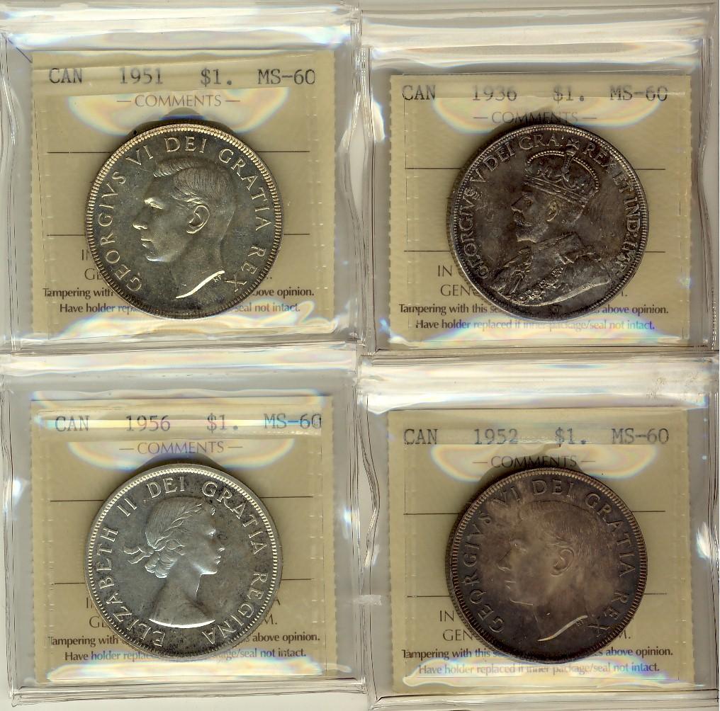 1936, 1951 Arnprior, 1952NWL , 1956, $1 all ICCS MS60, Lot of 4 coins,