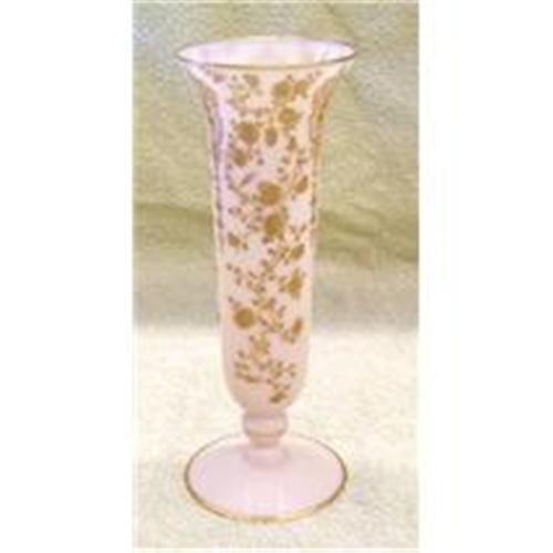 This is a beautiful cambridge 8" vase. It is crown tuscan with the rose point pattern in gold. The pattern shows up so nicely on the crown tuscan. It is in perfect condition with no cracks or chips and the gold is all good.