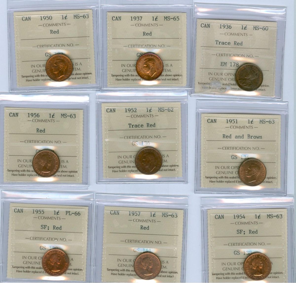 1936-1957 1¢ ICCS. Lot of 9 coins. Includes 1936 MS60 Trace Red, 1937 MS65, 1950 MS63RD, 1951 MS63RB, 1952 MS62 Trace Red, 1956 MS63RD, 1954 SF MS63RD, 1955 SF PL66, 1957 MS63RD.