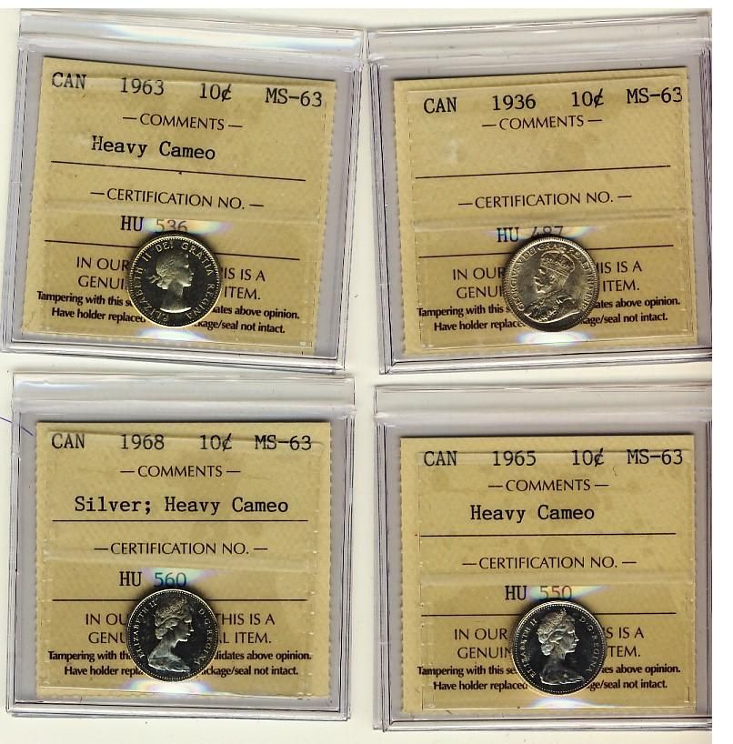 1936, 1963 HC, 1965 HC & 1968 Silv HC 10¢ ICCS MS63. Lot of 4 coins.