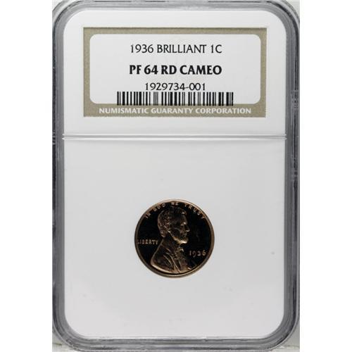 <B>1936 1C Brilliant PR64 Cameo NGC.</B></I> This series is not known for striking field-motif contrast. The near-Gem Red Cameo cent offered in this lot is certainly an exception, as the contrast is quite pronounced. It displays beautiful copper-orange color with a splash of crimson in the left obverse field and around the date area. The design elements are boldly impressed. One unobtrusive linear mark in the upper left reverse is all that keeps this awesome piece from a higher grade level.<BR><BR><b>Shipping:</b> Coin/Currency (<a target="_blank" href="http://www.heritageauctions.com/common/shipping.php">view shipping information</a>)