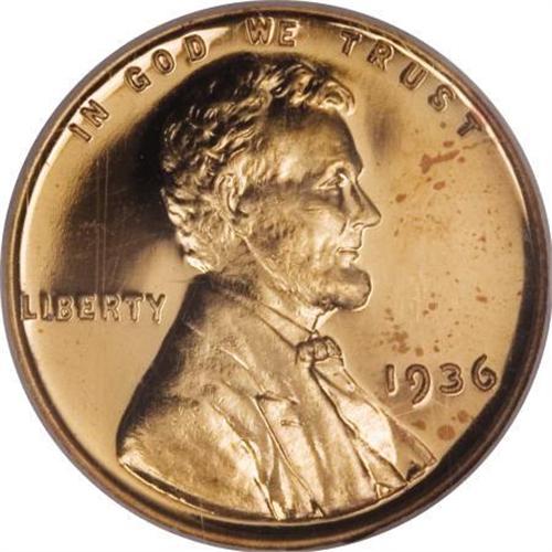 <B>1936 1C Type Two--Brilliant Finish--PR65 Red Cameo NGC.</B></I> The 1936 is even scarcer than its mintage of 5,569 pieces indicates. Two distinct finishes were used, Satin and Brilliant. Approximately equal numbers of each were struck, but collectors seek both variants for proof date sets. This is a deeply mirrored proof that shows a moderate overlay of mint frost on the devices, which of course, yields the cameo effect. Any 1936-1942 proof of any denomination is rare with a cameo contrast. Each side has deep cherry-red color with a few darker specks of color scattered about. <BR><BR><b>Shipping:</b> Coins & Currency (<a target="_blank" href="http://www.heritageauctions.com/common/shipping.php">view shipping information</a>)