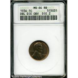 <B>1936 1C Doubled Die Obverse MS64 Red and Brown ANACS.</B></I> Die 2. Doubling is plainest on the 936 of the date. Lustrous surfaces display a golden-brown patina. A couple of minute marks and a few scattered light flecks limit the grade.<BR><I>From The Lonnie Gray Collection of Error Coins.</B></I> Lot:5538