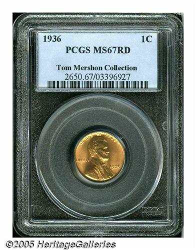 <B>1936<1C> MS67 Red PCGS.</B></I> Golden-red color glows from a nicely struck specimen of this date. Light marks can be seen on the bust under magnification.<BR><I>From The Tom Mershon #2 All-Time PCGS Registry Set of Lincoln Wheat Cents.</B></I>
