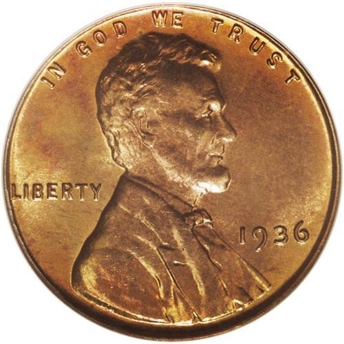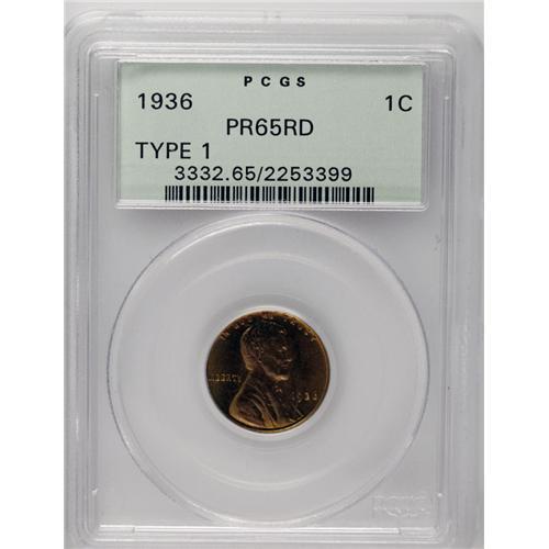 <B>1936<1C> Type One--Satin Finish--PR65 Red PCGS.</B></I> The cents and nickels in the early 1936 proof sets featured a Satin Finish, "sort of a hybrid between the older Matte (textured) Proof surface and the later Brilliant (mirrored) Proof surface," according to the Gale-Guth <I>United States Proof Sets and Mint Sets (1936-2002).</B></I> Once the collecting public realized that the Satin Finish coins were difficult to distinguish from the business strike coinage, few bothered to order examples. When the Mint changed to a brilliant finish later in the year, either the change was poorly publicized or collectors already had the proof coins they wanted. The Satin Finish proof coins are considerably rarer than their brilliant proof siblings. This example boasts reddish-yellow surfaces with glints of gold and magenta. There are no mentionable distractions. Certified in a green label holder.